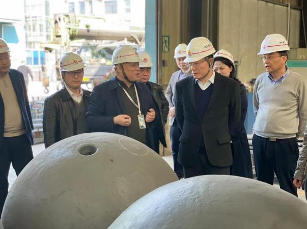3 月 11 日上午,市常務副市長黃化鋒在博望區書記竇念華、區長馬永陪同下,前往博望區新市工業園海天重工企業進行實地調研。一進入廠區,黃副市長就被停放在 2#廠房門口處的大球吸引住了,便走近向企業負責人詢問,當聽到企業負責人介紹該大型空心磨球產品現已替代進口,填補了國內空白,各項性能指標達到國際先進水平,產品工藝有明顯的集成創新特色,產品技術成果處于國內領先水平,黃化鋒副市長頗感興趣,頻頻點頭。