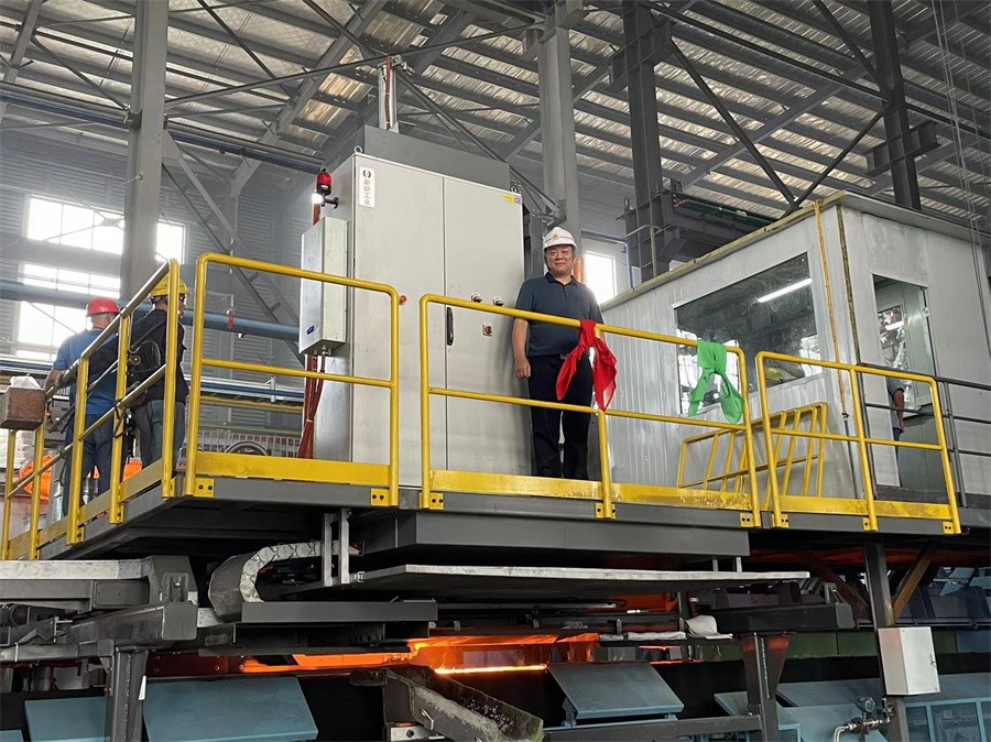 2022年9月12日上午八點十八分,隨著“出水”一聲令下,中頻爐第一爐鐵水緩緩傾入鐵水轉運包中,裝有鐵水的轉運包通過鐵水轉運系統自動運抵迪砂線澆鑄機, 鐵水通過自動澆注機完成澆注,整體生產線調試順暢,運行平穩,滿足設計要求。